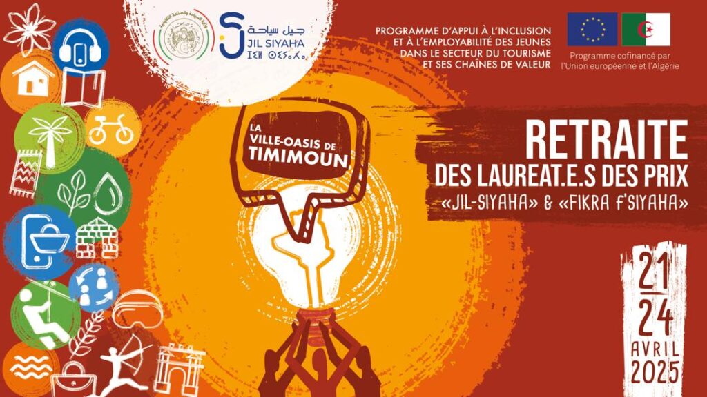 Dans le cadre du Programme JIL-SIYAHA, mis en œuvre au bénéfice du Ministère du Tourisme et de l’Artisanat et cofinancé par l’Union européenne et l’Algérie, une retraite immersive a réuni les lauréat.e.s des Prix « JIL-SIYAHA » et « FIKRA f’SIYAHA » à Timimoun, du 21 au 24 avril 2025.